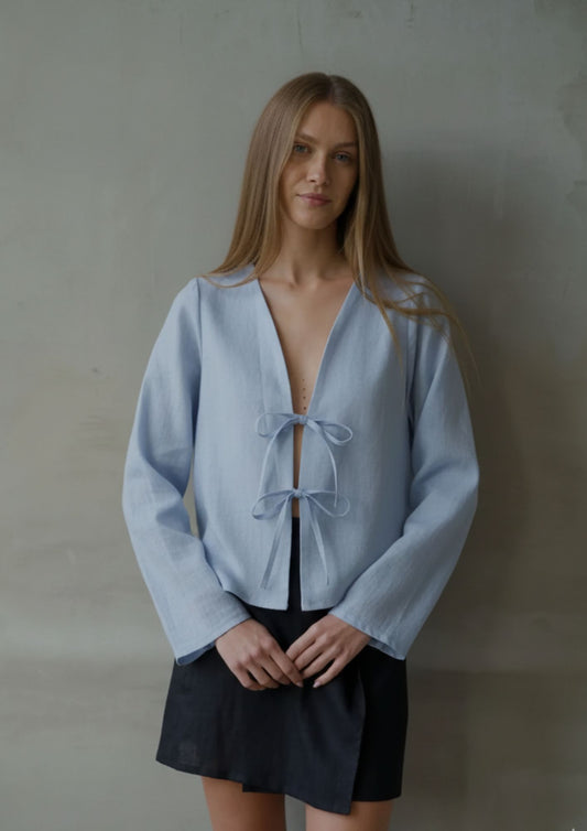 Linen Tie Front Top - Blue